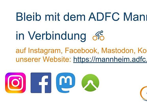 Folge dem ADFC Mannheim auf Instagram, Facebook, Mastodon, Komoot und unserer Website. Erfahre mehr über unsere Arbeit, aktuelle Aktionen und die aktuelle Serie zu den Unfallschwerpunkten des Radverkehrs in Mannheim.