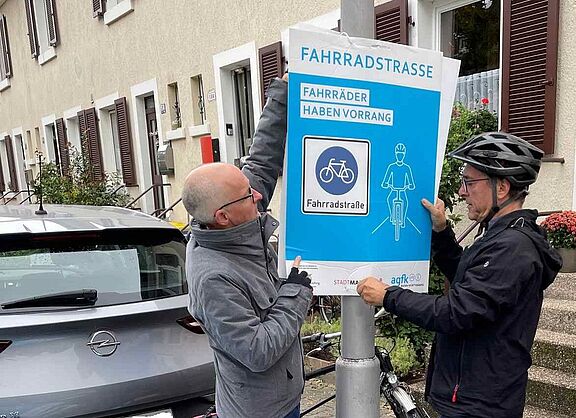 Der ADFC Mannheim und die Fahrradbeauftragte der Stadt Mannheim, Gabriele Fröhlich, greifen mit einer Plakatkampagne die Verkehrsregeln in Fahrradstraßen auf.