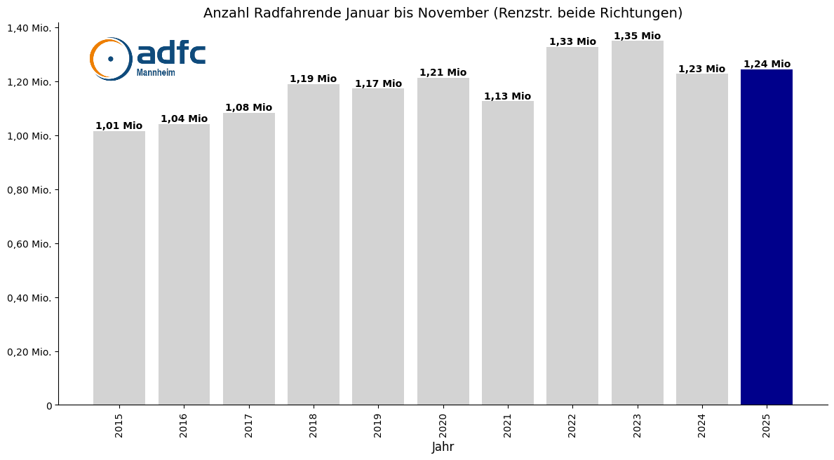 - Stagnation beenden: Die Zählstellen (z.B. Renzstraße siehe Grafik weiter unten) zeigen seit 2022 eine Stagnation im Radverkehr. Ohne neue Top-Infrastruktur werden die ambitionierten Ziele des Masterplans Mobilität verfehlt.