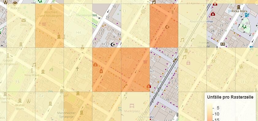 Unfallschwerpunkt Mannheim Quadrate: I1/I2, H1/H2 und G2/H2-G3