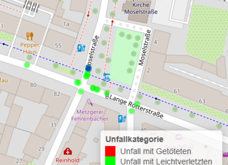 - Im November 2016 erlitt ein 61-jähriger Radfahrer schwere Verletzungen, als er mit einem Pkw kollidierte, der aus der Moselstraße in die Lange Rötterstraße einbog. Der Autofahrer wurde durch ein parkendes Fahrzeug in der Sicht behindert, während der Radfahrer entgegen der Fahrtrichtung unterwegs war.