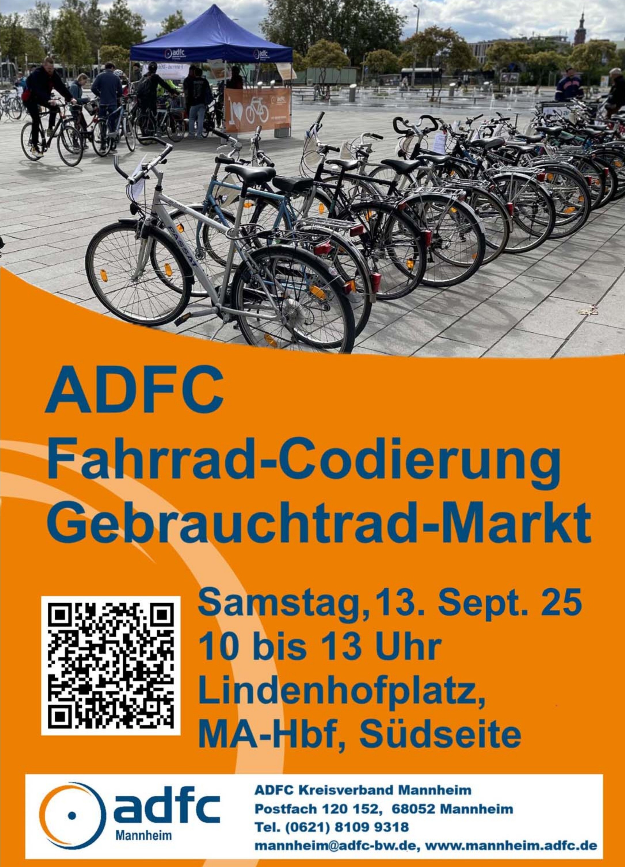 Der 71. Gebrauchtradmarkt des Allgemeine Deutschen Fahrrad-Clubs (ADFC) Mannheim findet am Samstag, den 13. September 2025 von 10 bis 13 Uhr wieder auf dem Lindenhofplatz (Hauptbahnhof Mannheim, Südausgang) statt. Auch Privatpersonen können hier ein gebrauchtes Rad verkaufen. Lediglich bei erfolgtem Verkauf wird eine Provision von € 3,00 fällig. Die Musterkaufverträge sind bei der Anmeldung vor Ort am ADFC-Infostand erhältlich.