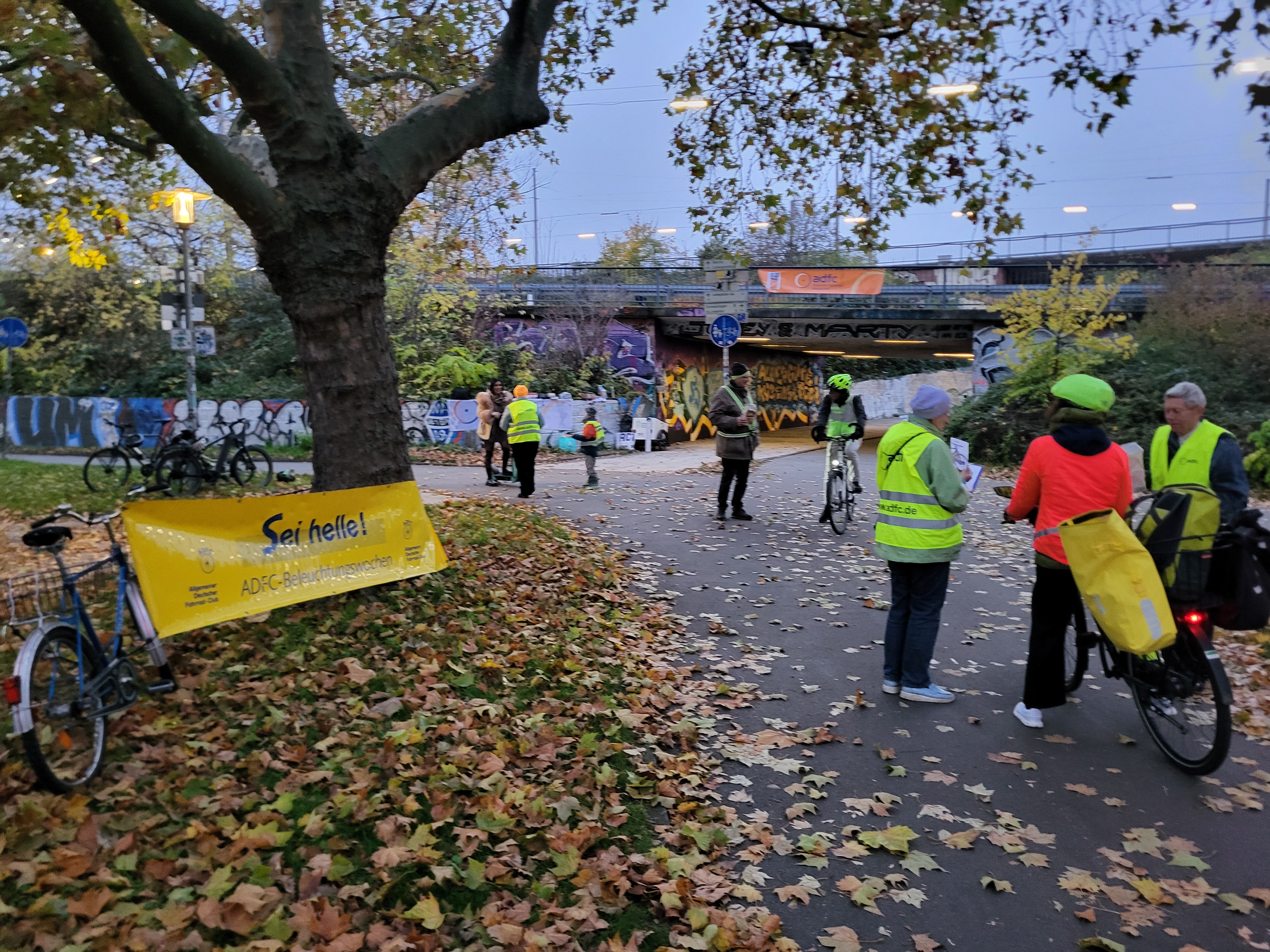 Lichtcheck am Freitagabend an der Konrad‑Adenauer‑Brücke: 263 Begegnungen, 227 Räder mit Licht (86%). Wir gaben Tipps zu Scheinwerfer‑Ausrichtung, Reflektoren und Sichtbarkeit in der dunklen Jahreszeit.