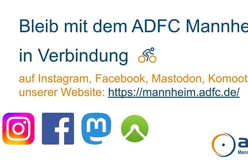 Der ADFC Mannheim ist auf vielen Kanälen aktiv: folge uns und bleib auf dem Laufenden über unsere Aktionen, Touren und verkehrspolitische Arbeit.