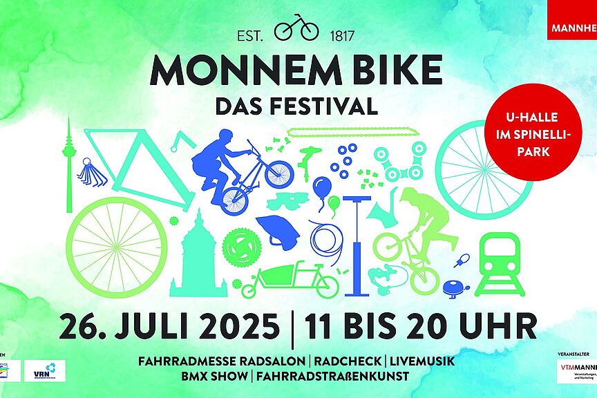 Am Samstag, den 26. Juli 2025, verwandelt sich der Spinelli-Park in Mannheim von 11 bis 20 Uhr in einen bunten Erlebnisraum für Fahrradfans – beim siebten „MONNEM BIKE – Das Festival“. MONNEM BIKE widmet sich dabei einen ganzen Tag lang der nachhaltigen Mobilität unter dem Schwerpunktthema Fahrrad und Radschnellweg bietet das Festival jede Menge Mitmachaktionen, Livemusik, Shows, Workshops und Infoangebote für Groß und Klein.
