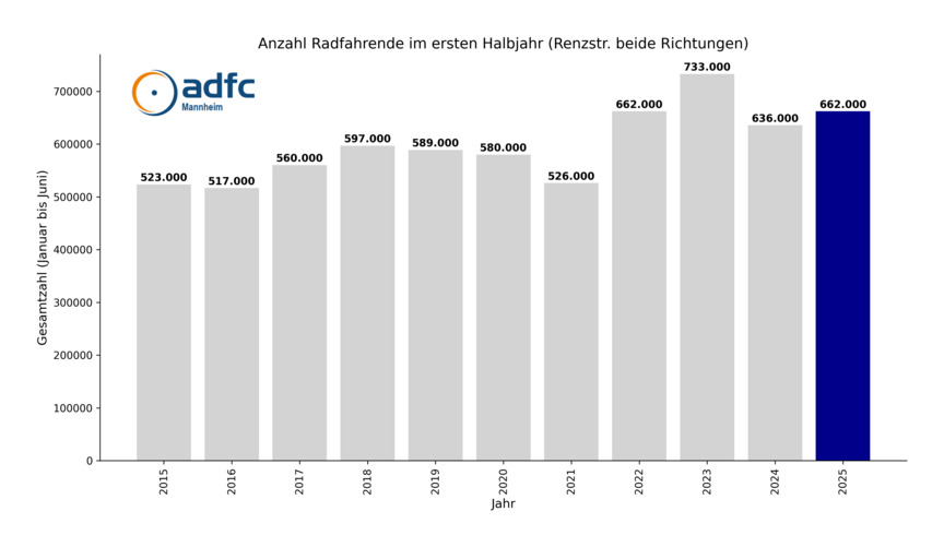 Die neuen Halbjahreszahlen sind da: An der Renzstraße wurden bis Juni 2025 rund 662.000 Radfahrende gezählt. Damit liegt Mannheim über dem Niveau von 2024 – aber noch unter dem BUGA-Rekordjahr 2023.