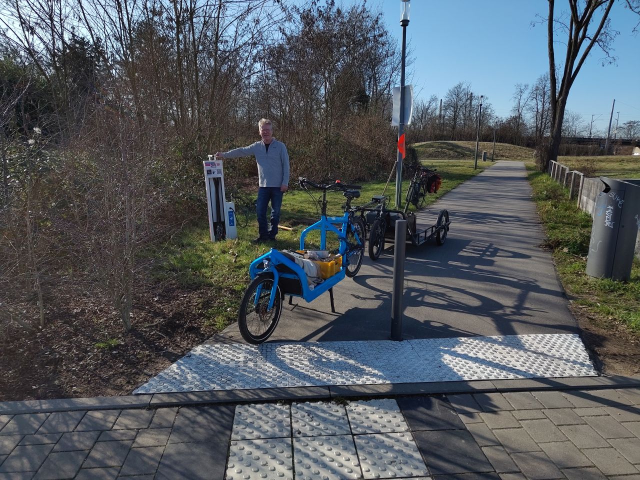 Die Radservicesäule des ADFC Mannheim am Radknoten musste werden der Schleusen-Bauarbeiten wie auch der gesamte Radknoten weichen. Die Säule wurde am Neckarplatt ersatzweise aufgestellt. Nun ist sie an ihren ‘alten’ Platz am Radknoten Schleuse Feudenheim zurückgekehrt.
