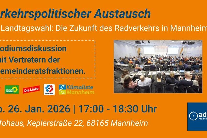 Der Eintritt ist frei. Wir freuen uns auf eine lebhafte Diskussion und zahlreiches Erscheinen, um gemeinsam ein starkes Zeichen für den Radverkehr in Mannheim zu setzen.
